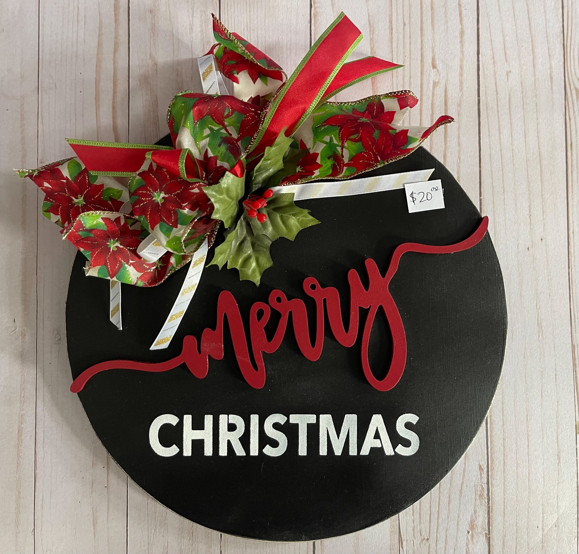 Once painted and stenciled, the 3D word "Merry" is attached. The entire design is sealed for outdoor use, and a rope hanger is attached to the back. A festive bow is added to the front. The weight of the item varies depending on size, and that will affect your shipping cost.