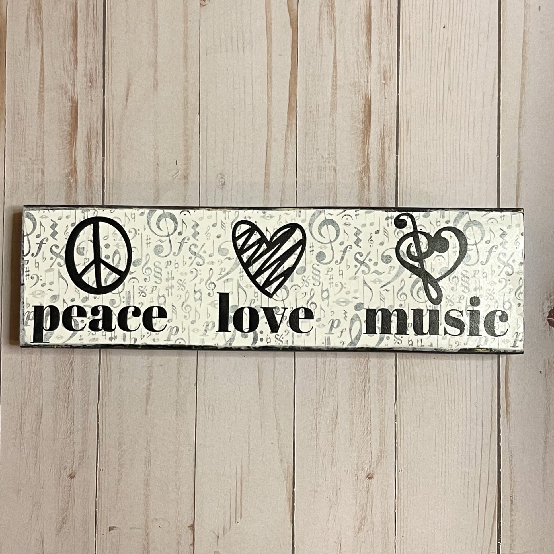 This shelf sitter is first painted, then adorned with a music note scrapbook paper before being stenciled with the message "Peace Love Music". Finally, the edges are distressed before a matte sealant is applied.
